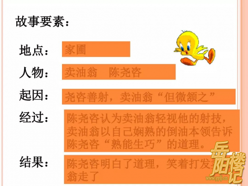 译文:老翁就取来一个葫芦放在地上,用一枚铜钱盖住葫芦的口,慢慢地用勺子倒油(通过铜钱方孔)注到葫芦里,(油)从铜钱的孔中注入葫芦,可是铜钱一点儿也没有被沾湿。老翁于是说:“我也没有什么别的(奥秘),只是手法熟练罢了。”康肃公笑着打发老翁走了。