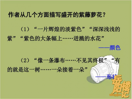 3.紫色的瀑布遮住了粗壮的盘虬卧龙般的枝干,不断地流着,流着,流向人的心底。(物我交融)