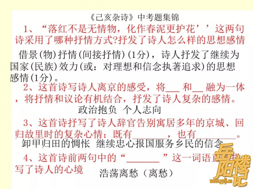 《己亥杂诗(其五)》:抒写了诗人辞官离京时的复杂感情,表现了诗人不畏挫折、不甘沉沦和始终要为国家效力的献身精神。
