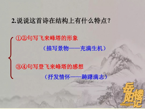 《登飞来峰》:诗人借景抒情、语言生动,从自然情景中很自然地提炼出深刻哲理,含蓄地表现了诗人高瞻远瞩,不畏艰难,立志改革的政治抱负。