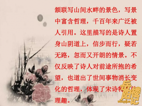 《游山西村》此诗写于宋孝宗乾道三年(1167),在此之前,陆游因为极力支持张浚北伐,北伐失败,陆游被罢归故里。诗人心中当然愤愤不平。对照诈伪的官场,家乡淳朴的生活自然会令作者产生无限的欣慰之情。此外,诗人虽貌似闲适,却始终忧怀国事。诗人并未丧失信心,深信总有一天会否极泰来。这种心境和所游之境恰相吻合,于是产生了传诵千古的“山重”“柳暗”一联。