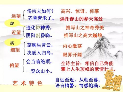 《望岳》:杜甫共写过三首《望岳》诗,分咏东岳泰山、西岳华山、南岳衡山。本课这首五言律诗为第一首。唐玄宗开元二十四年(736),杜甫曾在齐、赵漫游,故有此作。