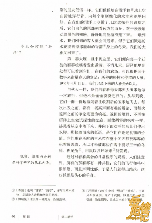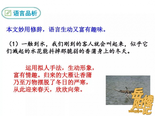 6.“一触到水,我们刚到的客人就会叫起来,似乎它们溅起的水花能抖掉那脆弱的香蒲身上的冬天。我们的大雁又回来了。”怎样理解这句话的含义?