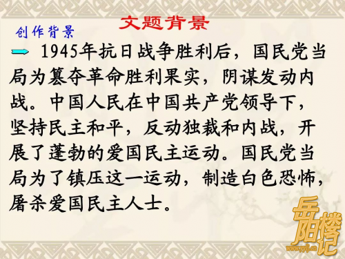 1945年抗日战争胜利后,国民党当局为篡夺革命胜利果实,阴谋发动内战。中国人民在中国共产党领导下,坚持民主和平,反动独裁和内战,开展了蓬勃的爱国民主运动。国民党当局为了镇压这一运动,制造白色恐怖,屠杀爱国民主人士。1946年7月11日,爱国民主人士李公朴先生在昆明被特务暗杀。特务们要暗杀的第二个对象就是闻一多,友人劝他躲一躲,但他毅然出席了15日举行的李公朴先生追悼大会,他事先没准备发言,但面对会场上特务们的无理取闹和嚣张气焰他忍无可忍,拍案而起,走上讲台,发表了这篇义正词严的讲演。当天下午,他就被暗杀。课文是这次讲演的记录整理稿,所以称为“最后一次讲演”。
