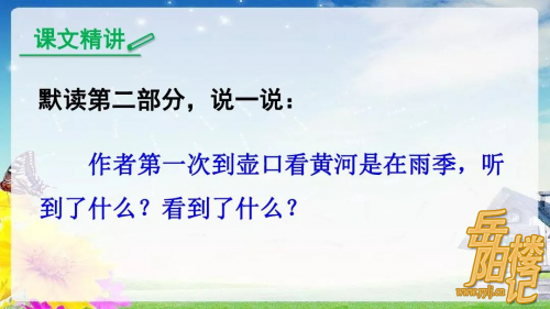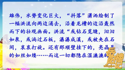 第4段:“顿然拢成一束,向龙槽里隆隆冲去,先跌在石上,翻个身再跌下去”“浑厚庄重如一卷飞毯从空抖落”中,“冲”“跌”“抖落”等动词的运用,写出了洪流向两边涌去,沿着龙槽的边沿轰然而下的画面,突出水势变化之大,表现了黄河壮阔的气势。“或钻石觅缝,汩汩如泉;或淌过石板,潺潺成溪;或被夹在石间,哀哀打旋”中,“觅”“淌”“夹”“打旋”等动词,写出了黄河水流在龙槽两边滩壁上散开的画面,赋予了黄河水流以生机活力。