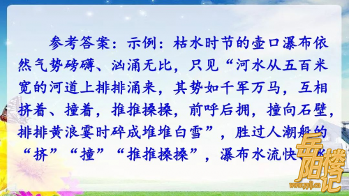 二、作者写枯水期的壶口瀑布,从三个角度进行观察,写出了壶口瀑布不同的特征:第3段主要写河水在上游的特点。先以“河心还有一条河,是突然凹下去的一条深沟……这便是‘壶口’”写壶口瀑布得名的原因。然后以“河水从五百米宽的河道上排排涌来,其势如千军万马,互相挤着、撞着,推推搡搡,前呼后拥,撞向石壁,排排黄浪霎时碎成堆堆白雪”等语句,从上游瀑布的声响、形状、态势、力量等方面,表现壶口瀑布令人震撼的气势,前赴后继、勇往直前的精神。最后从当地人对壶口瀑布的描述从侧面烘托水流之急,水力之大。