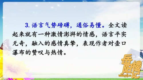 第3段:“河水从五百米宽的河道上排排涌来,其势如千军万马,互相挤着、撞着,推推搡搡,前呼后拥,撞向石壁,排排黄浪霎时碎成堆堆白雪”中,“涌”“挤”“撞”“推推搡搡”“撞”等动词的运用,使壶口瀑布令人震撼的气势呼之欲出。“当河水正这般畅畅快快地驰骋着时”句中的“驰骋”一词,既呼应了前文“其势如千军万马”的比喻,又生动地描绘出壶口瀑布处的黄河水汹涌奔腾的雄壮气势。“它们还来不及想一下,便一齐跌了进去,更闹,更挤,更急”中,动词“跌”“闹”“挤”等把壶口瀑布前赴后继、勇往直前的精神写活了。