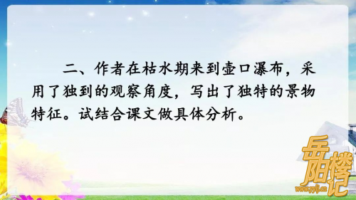 一、第一次在雨季观看壶口瀑布,课文初步勾勒了壶口瀑布壮阔的气势和令人惊心动魄的形象。第二次在枯水季节观看壶口瀑布,课文详细描写了壶口瀑布的雄伟、壮阔的气势和水的多样形态。