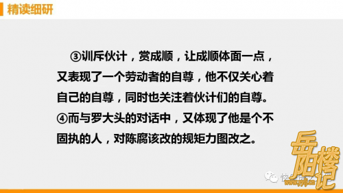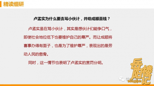 五、问题解疑1.本剧开篇的舞台说明有什么作用?本题运用舞台说明作用分析法。舞台说明交代了故事发生的时间、地点、人物和大年初六饭庄店铺大开张热火朝天的气氛。2.写全赢德的关张有什么作用?从侧面描写了福聚德的掌柜卢孟实善于经营。3.作者在此处安排王子西说出老爷子的死因这一情节有何用意?写老爷子窝囊而死与后文罗大头撂杆子走人,说出卢孟实的身世相照应。4.为什么要写“给侦缉队送礼”“那可是些惹不起的祖宗”?说明在那个年月做生意不容易,突出了卢孟实聪明多谋,八面玲珑,也暗示当时社会的黑暗腐朽。5.通过唐茂昌和王子西的对话,可以看出卢孟实在唐家是什么地位?唐茂昌根本没把卢孟实放在眼里,只是把他当作唐家的奴仆,从“这儿全是大爷的”“这儿是老唐家的买卖”“柜上的事儿,你得下心”可以看出唐茂昌一直在提防着卢孟实,认为他贪唐家的钱。6.卢孟实为什么不让店员看落子、听花鼓?当时人们认为从事这些行当的人主要是服侍他人,社会地位低下。他不让自己的店员看落子、听花鼓,是想用这种做法证明做饭庄子的也是体面的,不能叫人瞧不起,要活出自己的尊严。7.如何理解卢孟实骂小伙计,给成顺喜幛子钱?卢孟实骂小伙计,是想让伙计们能争口气,即使社会地位低下也要维护自己的尊严。给成顺喜幛子钱,让成顺将喜事办得有面子,也是为了维护尊严。他为了证明做饭庄子的也是体面的,不能叫人瞧不起。8.从罗大头与卢孟实的对话中,可以看出罗大头是一个怎样的人?本题可运用人物性格概括法。从两人的对话中可以看出罗大头的技艺精湛,是店里的“顶梁柱”之一,但是他固执,不知变通,如强调不到七十不传徒弟;自恃技艺精湛,心胸狭窄,容不得人,动辄撂杆子走人;脾气火爆。不过他看重自身的价值与名誉,丝毫瞧不起克五那种混吃混喝、人品卑污的“爷”。9.结合文章内容分析卢孟实这一人物形象。卢孟实在未出场时就通过王子西等人的评价,“咬牙跺脚地干”,侧面表现出他是一个务实勤劳的人。卢孟实一出场,便不与克五这样的游手好闲之辈打交道,且将事情安排妥帖,这就说明卢孟实是个精明能干的人。训斥伙计,厚赏成顺,让成顺体面一点儿,又表现了一个劳动者的自尊,他不仅关心着自己的尊严,同时也关注着伙计们的自尊。而与罗大头的对话,又体现了他不是一个固执的人,对该改的规矩力图改之。从他对待罗大头的过程中又能见其刚直的性格。这与后来东家二少爷出场时他的表现似有所矛盾,对待这位东家二少爷,卢孟实依然要赔着笑脸应对,这是那个时代阶级之分下朴实劳动人民的悲剧。10.本文的语言具有方言特色,甚至有些方言比较低俗,你如何看待这个问题?请结合文章做简要分析。如王子西说:“要不孟实这么咬牙跺脚地干,心里窝着口气”,一个“窝”字将方言特征凸显无疑;又如卢孟实骂小伙计时说“瞎话!”“下作的东西”,这里不仅方言味十足,且显得比较低俗。但是,呈现出这样的语言特征是有必要的。首先,作者选取的是北京的福聚德,倘若不用方言,便失了京味。其次,话剧所表现的是真实,福聚德绝不是一个雅文化的聚集地,文中的语言正是当地真实的语言,还原场景语言最真实的特征,而这也正是以方言表现其真实性,才将话剧中的诸多人物形象刻画得有血有肉。五、课文主题课文主要描写了福聚德烤鸭店由名噪京师而又面临倒闭的曲折发展历程,歌颂了卢孟实、常贵等人的聪明才智、事业心与实干精神,控诉、批判了游手好闲的败家子习气和黑暗腐朽的社会势力。课后习题参考答案