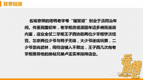 何冀平(1951—),中国剧作家。中央戏剧学院戏剧文学系毕业,毕业后从事专职戏剧创作,曾任北京人民艺术剧院编剧。十二岁作文《我的家庭》得满分,进师大女附中。六六文革,广阔天地再教育!黄土高原,打麦场挂煤灯,捻棉花照明,笔耕不辍。七七年后,中戏戏文首招生,五千考生杀出重围,圆了大学梦。四年毕业得入人艺剧本组。“夜深灯火上矾楼”,1988年,何冀平创作的《天下第一楼》演出后轰动京城,被誉为当代现实主义经典。八九年随家移居香港,之后,投身影视创作,完成了《新白娘子传奇》,《新龙门客栈》《龙门飞甲》等作品。又有五部话剧,三千万制作《烟雨红船》。灯火阑干维多利亚海港,香港今夜最美。先生如今早是六十耳顺年,文字老辣幽默,深刻隽永,“娥眉不让须眉”。二、故事背景民国初年,北京前门外老字号福聚德烤鸭店的掌柜(老东家)唐德源年事已高,两个儿子又不争气,饭店经营不善。老掌柜去世前,将买卖交给精明强干的同乡卢孟实经营。卢孟实重订店规,调整人员,改良菜式,新建大楼,斡旋于各方势力、各类人物之间,将福聚德的事业推上顶峰。但在东家、官府等的内外逼压、破坏下,卢孟实最终没有能真正实现自己的梦想,被逼还乡,福聚德也由盛转衰。课文是剧本第三幕的节选。三、理解词义幌子:俗称酒帘。古代酒店以其容易引人注目,故用为招牌,以招揽顾客。侦缉:侦查缉捕。懦弱:软弱无能;柔弱。忌讳:因风俗习惯或个人原因等,对某些言语或举动有所顾忌,积久成为禁忌。拾掇:整理;收拾。捣蛋:凄凉悲惨。借端生事,制造麻烦,无理取闹。凄惨:凄凉悲惨。雕梁画栋:指房屋的华丽的彩绘装饰。咬牙跺脚:文中指下定决心。另请高明:另外请一个较高明的人,意即不想受委托或聘请。骂骂咧咧:指在说话中夹杂着骂人的话。四、文章结构