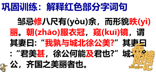(一天)早晨,(邹忌)穿戴好衣帽,照着镜子,对他的妻子说:“我与城北徐公相比,哪一个美?”他的妻子说:“您美得很,徐公哪里能够比得上您呢?”城北的徐公,是齐国的美男子。