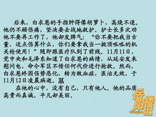 白求恩(1889-1939),国际主义战士。加拿大共产党员,胸外科医师。中国抗日战争爆发后,为了支援中国人民的解放事业,他受加拿大共产党和美国共产党的派遣,率领由加拿大人和美国人组成的医疗队来到中国,于1938年春上到达延安,不久转赴晋察冀边区工作。他对工作极端负责,对同志对人民极端热忱,以精湛的医疗技术,为中国的抗日军民服务,并培养了大批医务干部,为中国人民的解放事业作出了卓越的贡献。后因抢救伤员感染中毒,1939年11月12日在河北唐县逝世。白求恩逝世一个多月后的12月21日,毛泽东同志写下了《纪念白求恩》这篇文章。