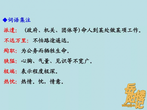 殉职:为公务而牺牲生命。动机:促使人从事某种活动的念头。狭隘:心胸、气量、见识等不宽广。极端:事物发展所达顶点。热忱:热情。冷清:冷落寂寞;冷静而凄凉。 纯粹:不掺杂其它成分的;无掺合物的;不含添加、替代或异质物质的。 佩服:对某人或某事发自内心的敬仰和崇拜。高明:见解独到不同凡人,或技艺高超。鄙薄:鄙视菲薄,轻视。出路:能够向前发展的途径;摆脱逆境的门路,前途。拈轻怕重:指接受工作时挑拣轻松的,害怕繁重的。漠不关心:态度冷淡,毫不关心。麻木不仁:本义是肢体麻木,没有感觉。比喻对外界事物反应迟钝或漠不关心。这里指缺乏热情,对集体和人民的利益不关心。 精益求精:好了还求更好。见异思迁:看到别的事物就想改变原来的主意。这指不安心工作,事业心不强。